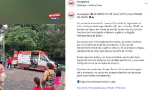 Um acidente envolvendo duas motocicletas foi registrado no início da tarde desta segunda-feira (2), por volta das 15h45, na Estrada da Ceasa, em frente ao portão de entrada do Instituto Nacional de Colonização e Reforma Agrária, na Região Metropolitana de Belém.